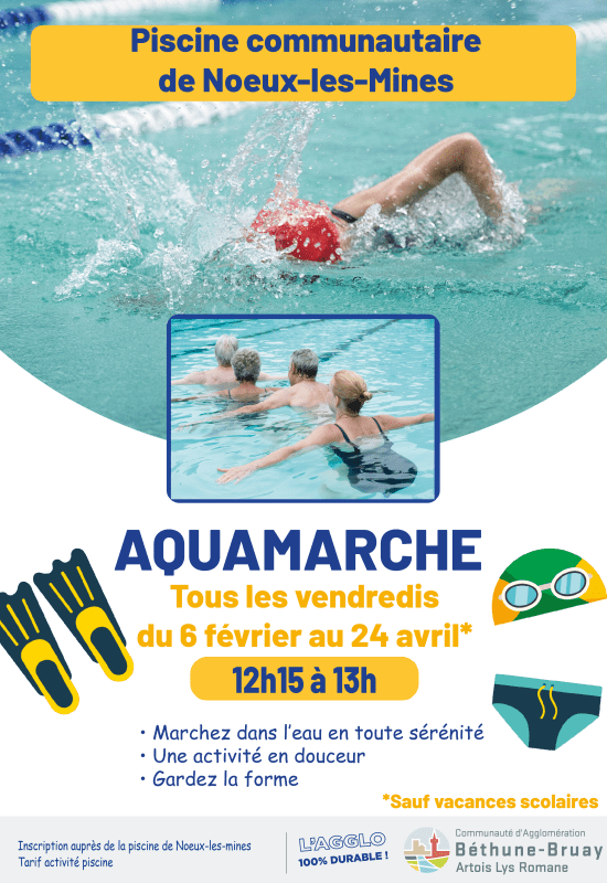 Venez découvrir l'aquamarche à la piscine de Noeux-les-Mines tous les vendredis* du 6 février 2026 au 24 avril 2026 de 12h15 à 13h.