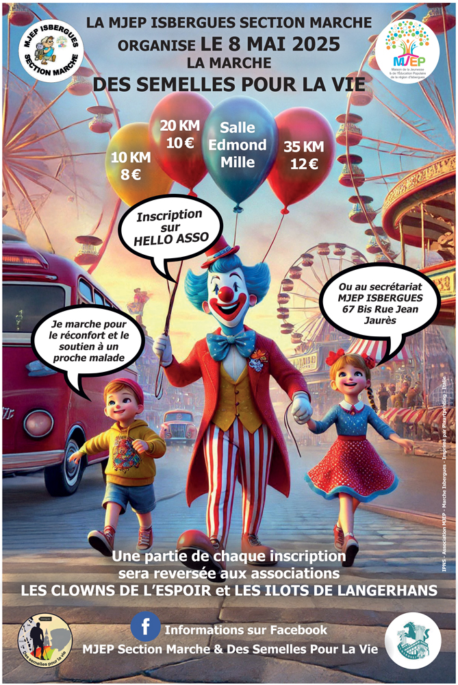 35 km "les téméraires" (3 ravitaillements) 20 km "les courageux" (2 ravitaillements). 10 km "les gentils prudent plein d'amour" (1 ravitaillement) Inscription sur HelloAsso (taper dans la barre "mjep section marche") ou inscription au secrétariat Mjep Isbergues au 67 bis rue Jean Jaurès à Isbergues