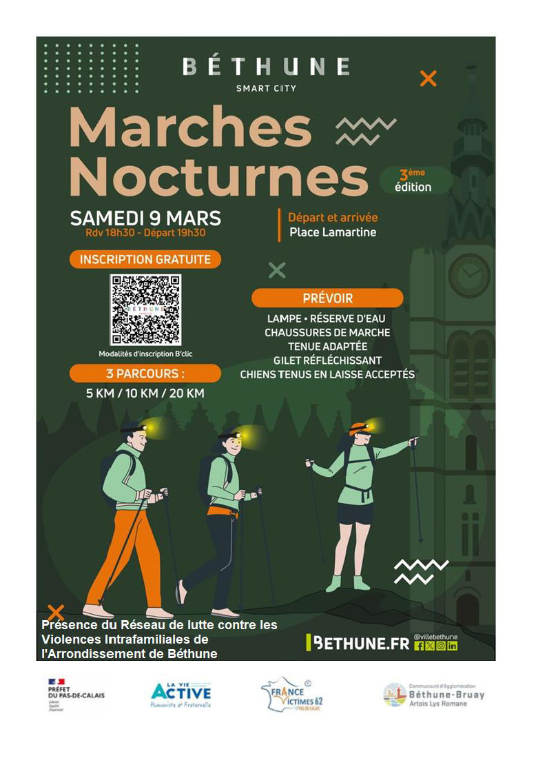 En partenariat avec la ville de Béthune et l'Agglomération, le réseau Violences Intra-Familiales (VIF) nous convie à une marche nocturne, promouvant les droits des femmes.
